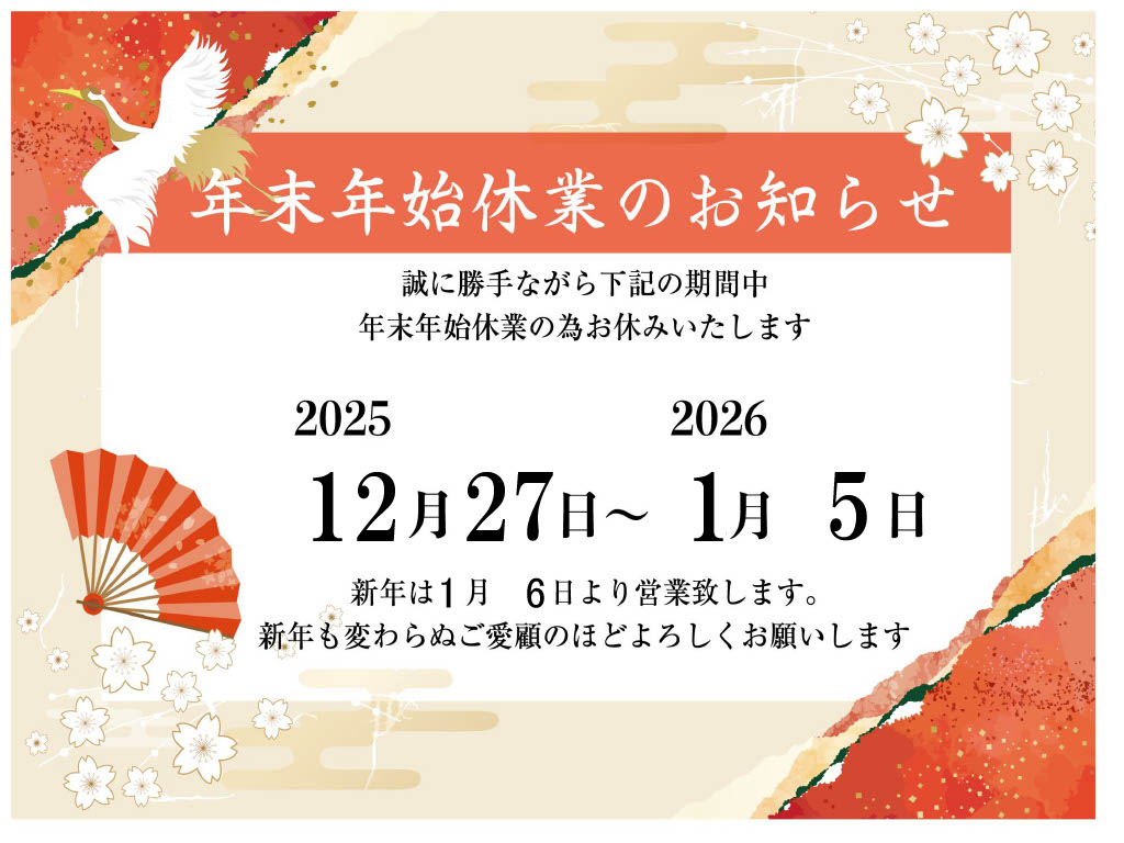誠に勝手ながら上記期間休業させていただきます。皆様にはご不便おかけしますが、何卒ご了承くださいますようお願いいたします。